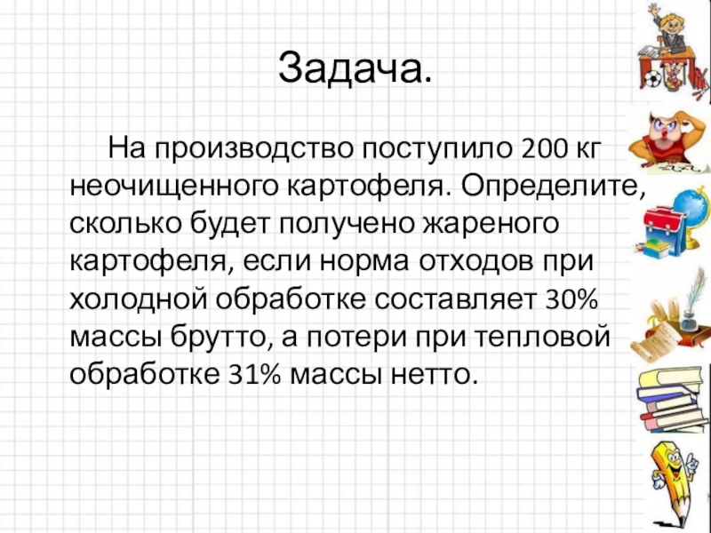 картофеля. Определите, сколько будет получено жареного картофеля, если норма отходов при холодной обработке составляет 30% массы брутто, а потери при тепловой обработке 31% массы нетто.