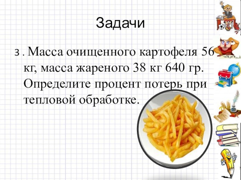 3 . Масса очищенного картофеля 56 кг, масса жареного 38 кг