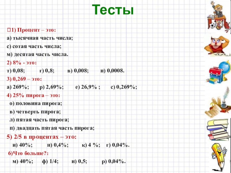 м) 40%; ф) 1/4; н) 0,5; р) 0,04%.