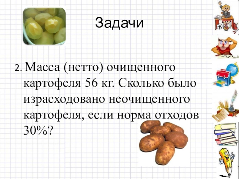 2. Масса (нетто) очищенного картофеля 56 кг. Сколько было
