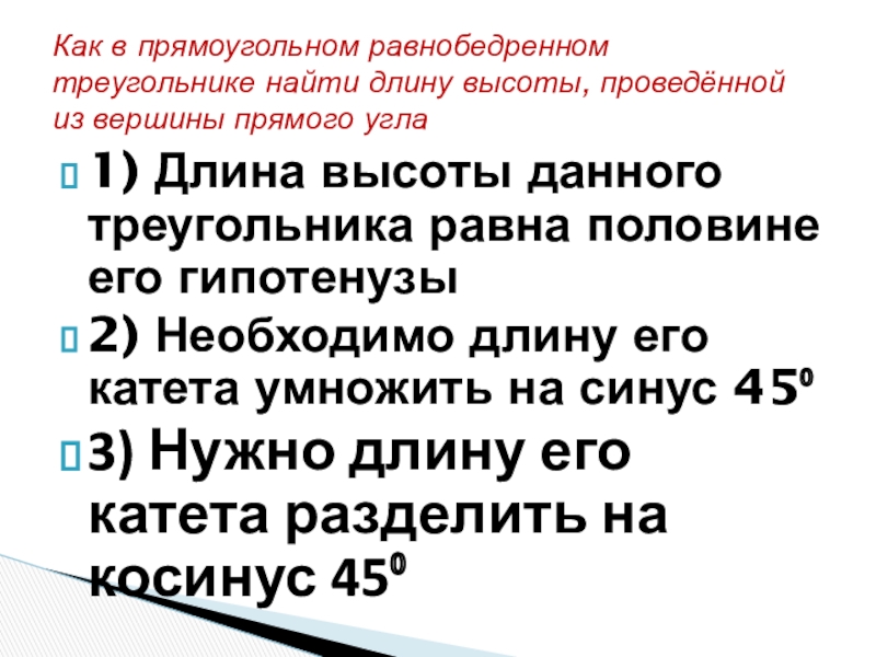 Как в прямоугольном равнобедренном треугольнике найти длину высоты, проведённой из вершины прямого угла