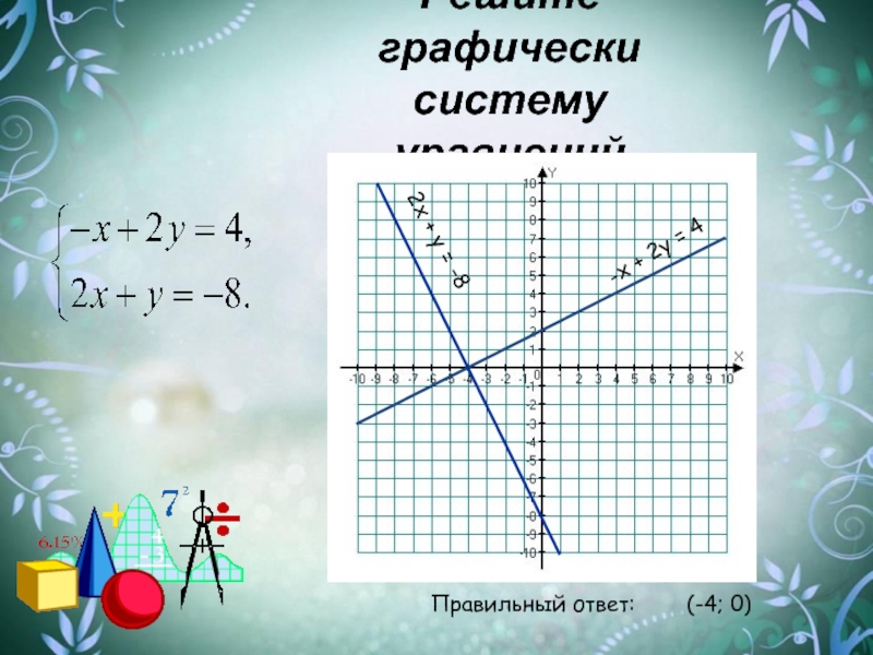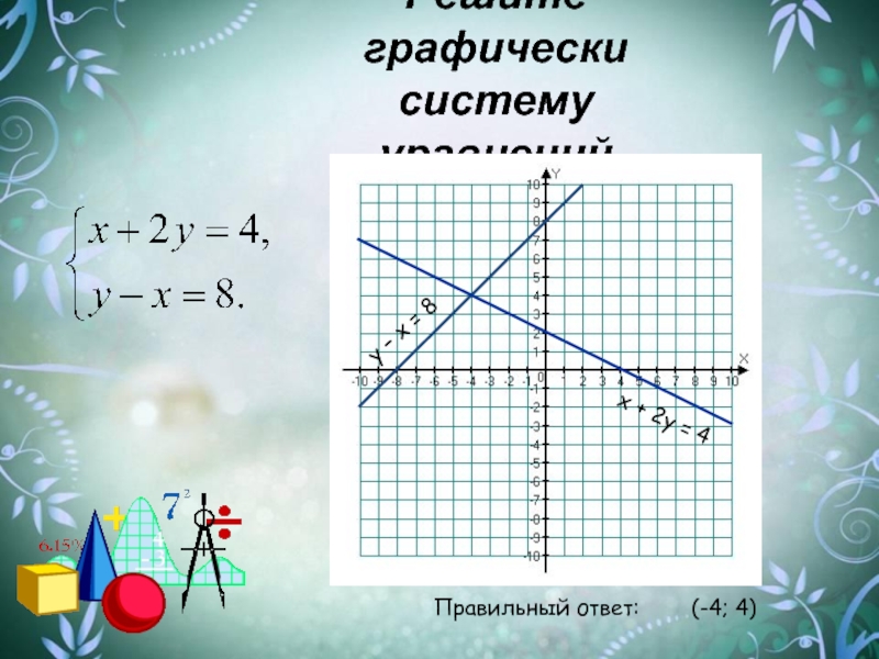 Решите графически систему уравненийх + 2у = 4у – х = 8Правильный ответ:(-4; 4)