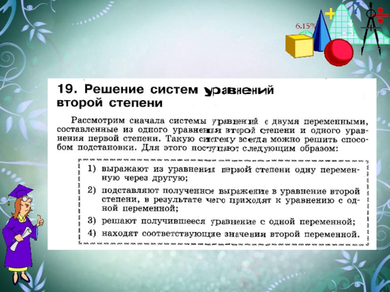 112 учебника (правило решения систем уравнений 2 степени способом подстановки)