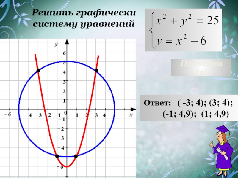Решить графически систему уравненийПроверка (2) Ответ:  ( -3; 4); (3; 4);     (-1;