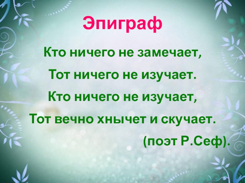 ЭпиграфКто ничего не замечает,Тот ничего не изучает.Кто ничего не изучает,Тот вечно хнычет и скучает.(поэт Р.Сеф).