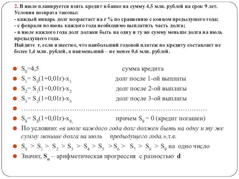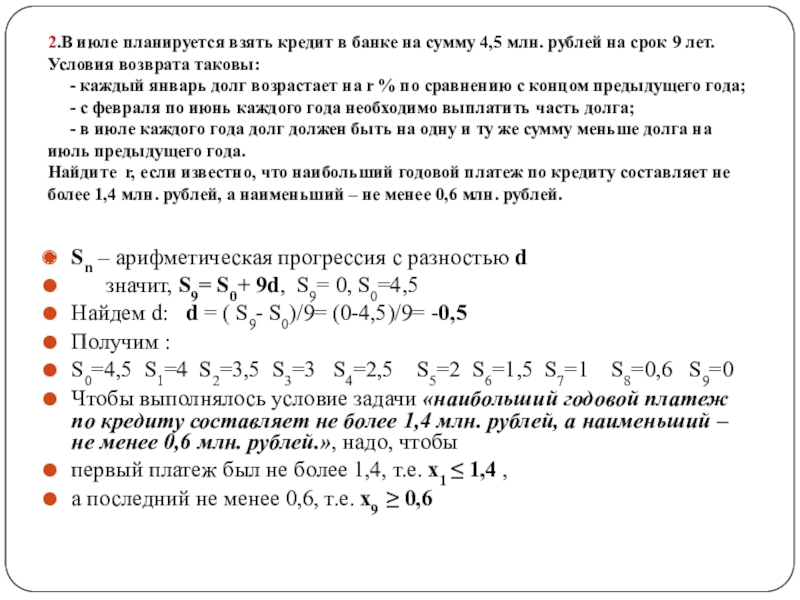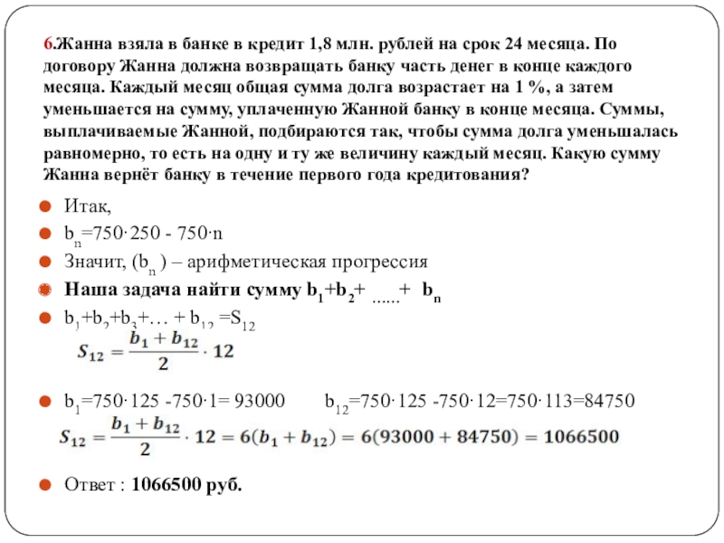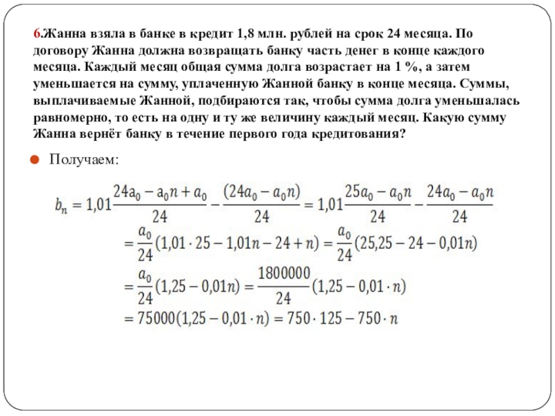 По условию а0 > а1 >…. > аn - арифметическая прогрессия, так как «Суммы, выплачиваемые Жанной, подбираются так, чтобы сумма долга уменьшалась равномерно, то есть на одну и ту же величину каждый месяц.»