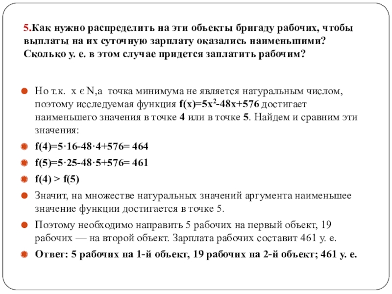 Но т.к. х є N,а точка минимума не является натуральным числом, поэтому исследуемая функция f(x)=5х2-48х+576 достигает наименьшего значения в точке 4 или в точке 5. Найдем и сравним эти значения: