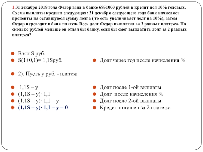 S руб. - Взяли в кредит, х – одна выплата