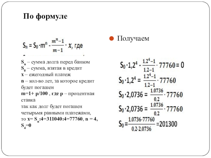1,2((1,2(1,2(1,2S – х) –х) – х)) – х = 0 кредит погашен четырьмя выплатами
