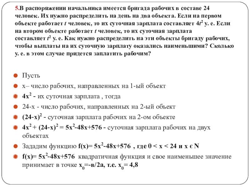 4х2 + (24-х)2 = 5х2-48х+576 - суточная зарплата рабочих на двух объектах