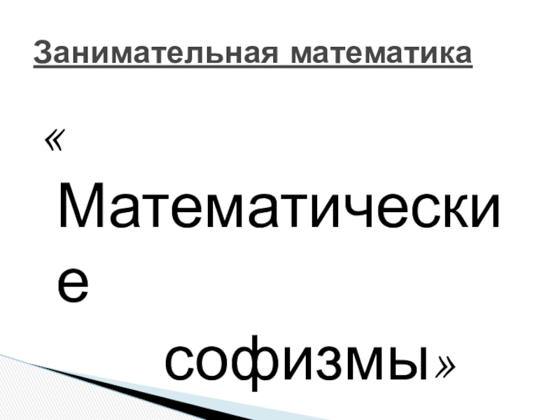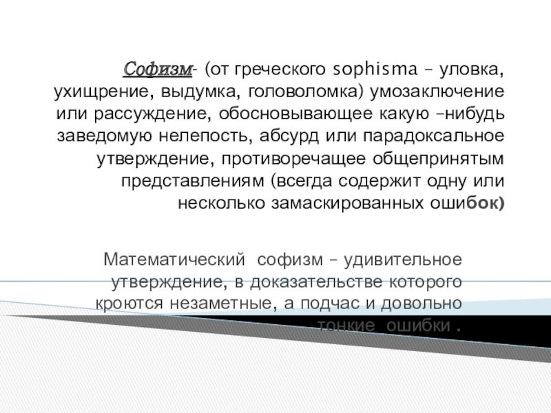 Математический софизм – удивительное утверждение, в доказательстве которого кроются незаметные, а подчас и довольно тонкие ошибки .
