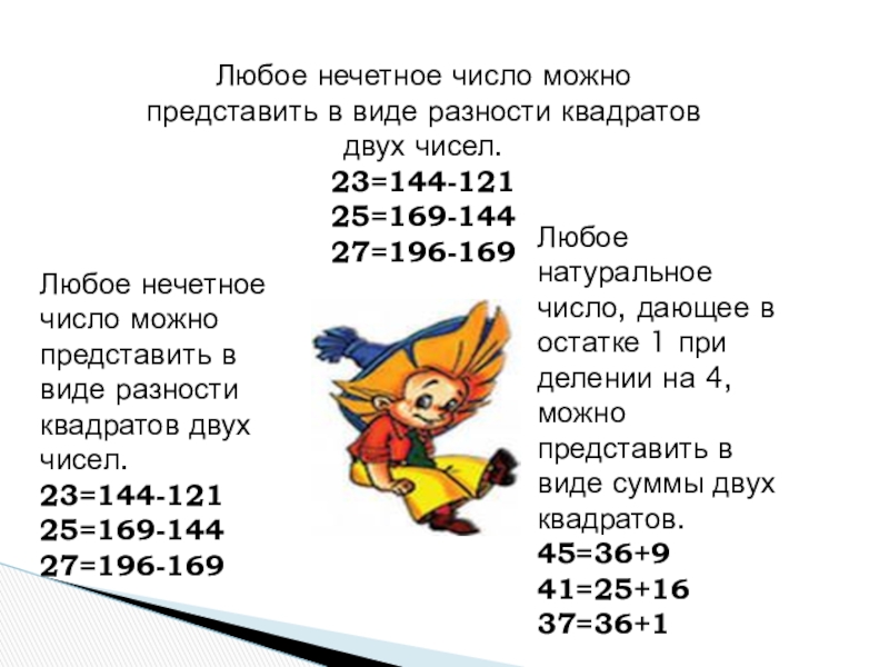 Любое натуральное число, дающее в остатке 1 при делении на 4, можно представить в виде суммы двух квадратов.