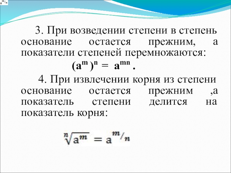 4. При извлечении корня из степени основание остается прежним ,а показатель степени делится на показатель корня: