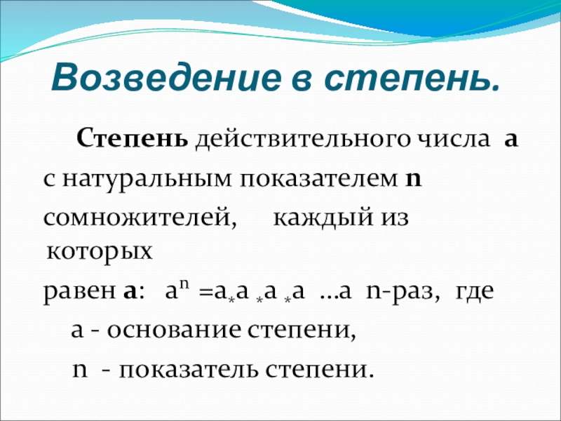 Возведение в степень. Степень действительного числа а с натуральным показателем n сомножителей, каждый из которых равен а: аn =a*a *a *a …a n-раз, где