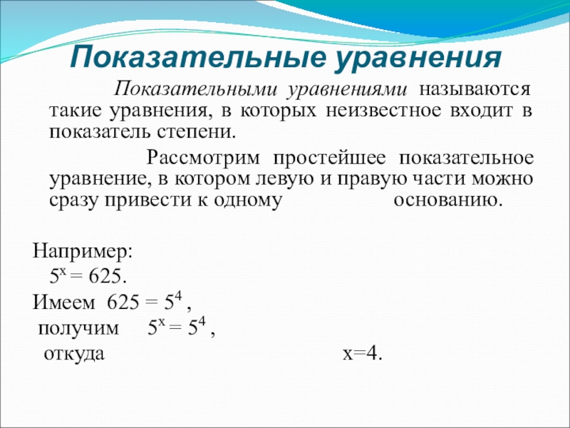 Показательные уравнения    Показательными уравнениями называются такие уравнения, в которых неизвестное входит в показатель степени.
