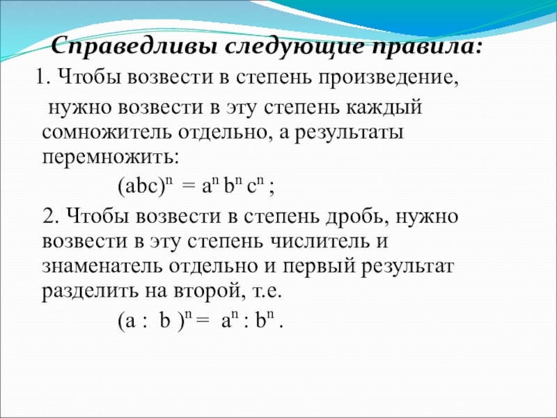 Справедливы следующие правила: 1. Чтобы возвести в степень произведение,  нужно возвести в эту степень