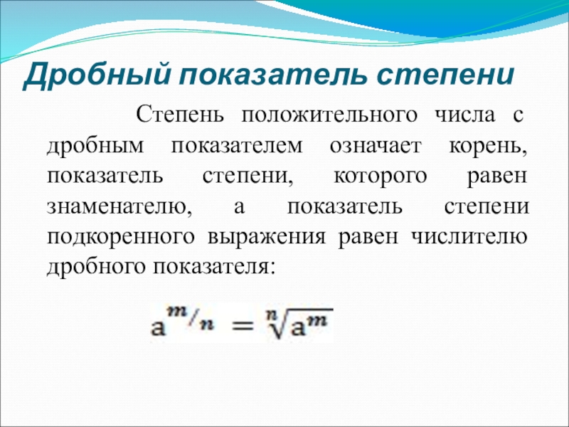 Дробный показатель степени    Степень положительного числа с дробным показателем означает корень, показатель степени, которого