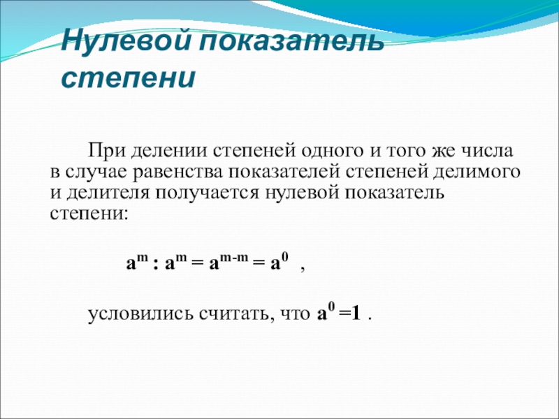 При делении степеней одного и того же числа в случае равенства показателей степеней делимого и делителя получается нулевой показатель степени: