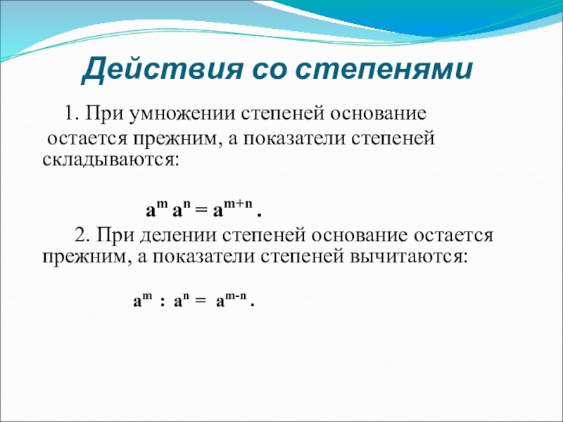 Действия со степенями    1. При умножении степеней основание  остается прежним, а показатели степеней