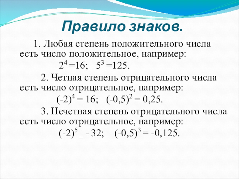 Правило знаков.        1. Любая степень положительного числа есть число положительное,