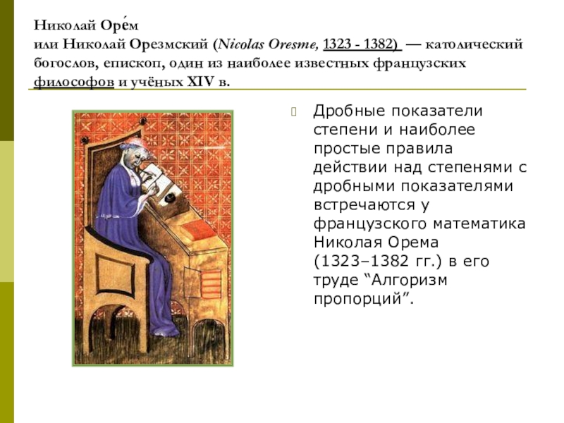 или Николай Орезмский (Nicolas Oresme, 1323 - 1382) — католический богослов, епископ, один из наиболее известных французских философов и учёных XIV в.