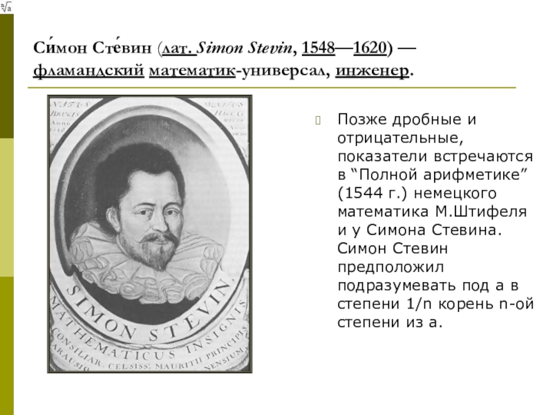 Си́мон Сте́вин (лат. Simon Stevin, 1548—1620) — фламандский математик-универсал, инженер.