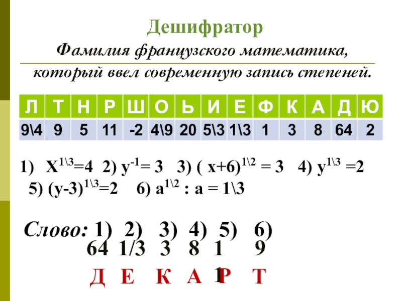 Х1\3=4 2) у-1= 3 3) ( х+6)1\2 = 3 4) у1\3 =2
