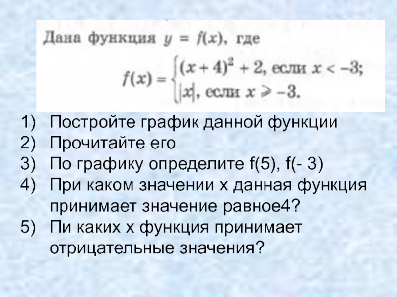 Постройте график данной функцииПрочитайте егоПо графику определите f(5), f(- 3)При каком значении х данная функция принимает значение