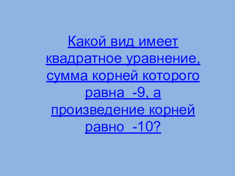 Слайд 16Какой вид имеет квадратное уравнение, сумма корней которого равна -9, а