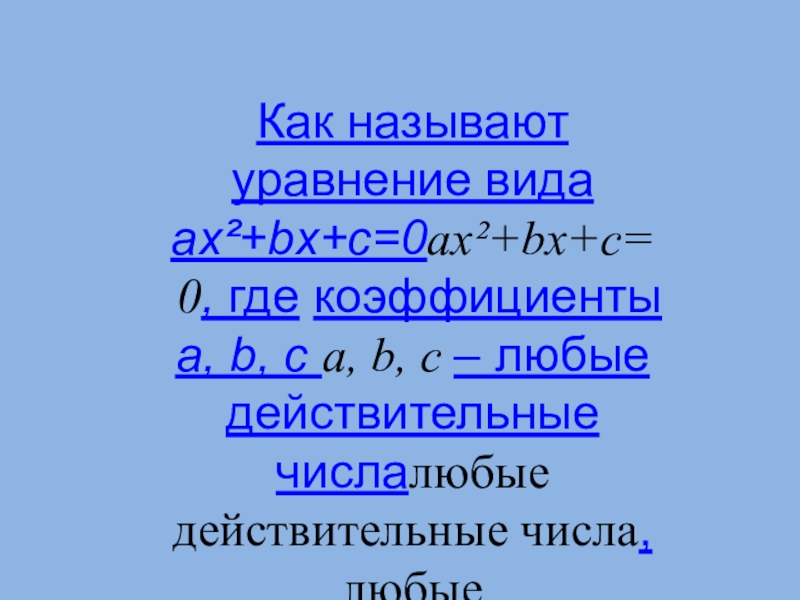 Как называют уравнение вида ax²+bx+c=0ax²+bx+c=0, где коэффициенты a, b, c a, b, c – любые действительные числалюбые