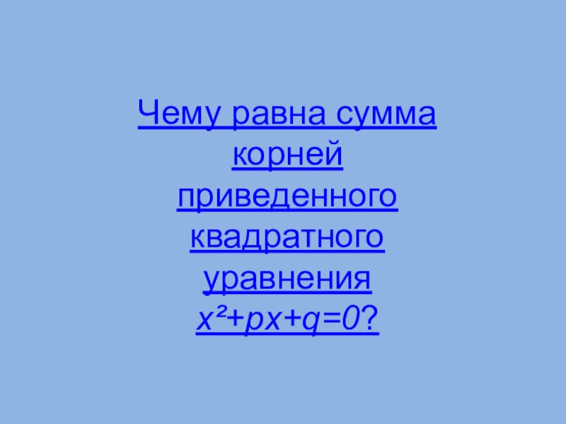 Слайд 14Чему равна сумма корней приведенного квадратного уравнения x²+px+q=0?
