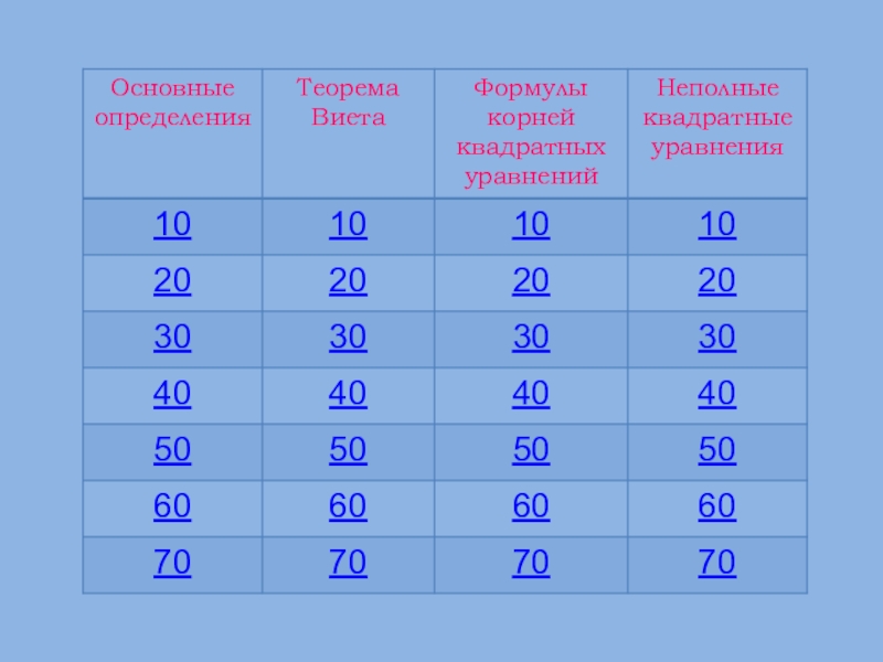 Презентация, доклад по математике Своя игра на тему Квадратные уравнения (8 класс)