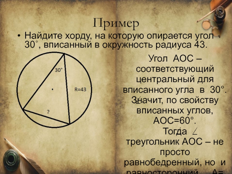 Найдите хорду, на которую опирается угол 30˚, вписанный в окружность радиуса