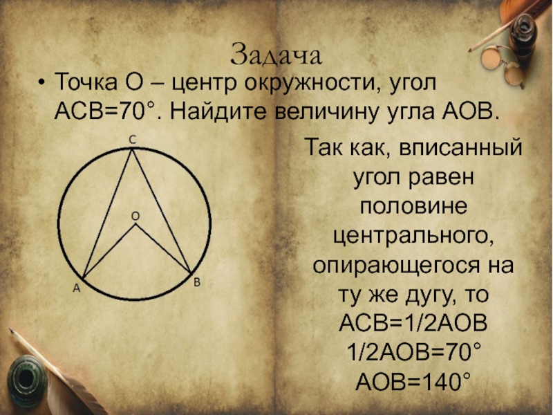 Точка О – центр окружности, угол АСВ=70°. Найдите величину угла АОВ.