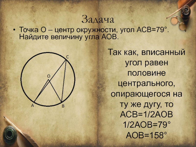Точка О – центр окружности, угол АСВ=79°. Найдите величину угла АОВ.