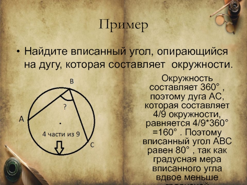 дуга АС, которая составляет 4/9 окружности, равняется 4/9*360°=160° . Поэтому вписанный угол АВС равен 80° , так как градусная мера вписанного угла вдвое меньше градусной меры дуги, на которую опирается.