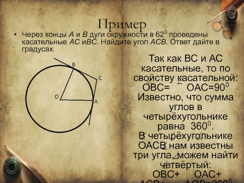 Через концы A и B дуги окружности в 620 проведены касательные AC иBC. Найдите угол ACB. Ответ дайте в