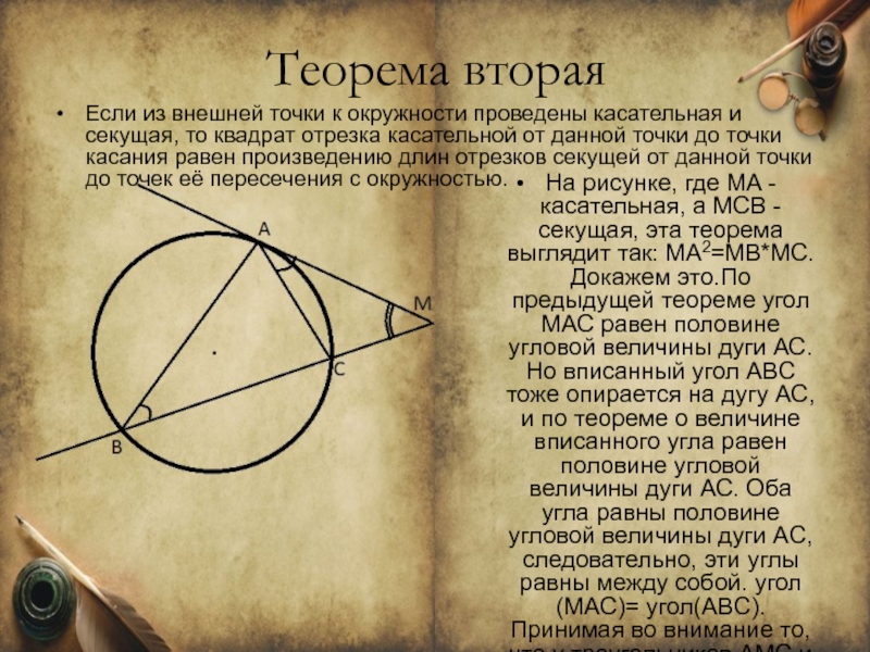 теорема выглядит так: МА2=МВ*МС. Докажем это.По предыдущей теореме угол МАС равен половине угловой величины дуги АС. Но вписанный угол ABC тоже опирается на дугу AC, и по теореме о величине вписанного угла равен половине угловой величины дуги АС. Оба угла равны половине угловой величины дуги AC, следовательно, эти углы равны между собой. угол(MAC)= угол(ABC).