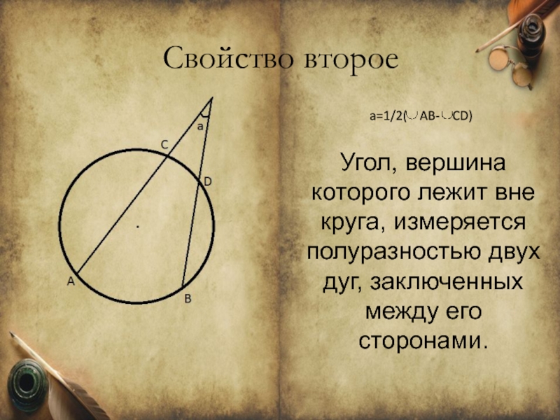 измеряется полусуммой двух дуг, одна из которых заключена между его сторонами, а другая – между продолжениями сторон.
