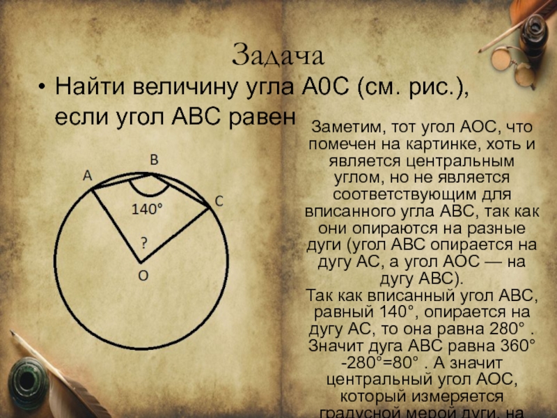 Так как вписанный угол АВС, равный 140°, опирается на дугу АС, то она равна 280° . Значит дуга АВС равна 360°-280°=80° . А значит центральный угол АОС, который измеряется градусной мерой дуги, на которую опирается, равен 80°.