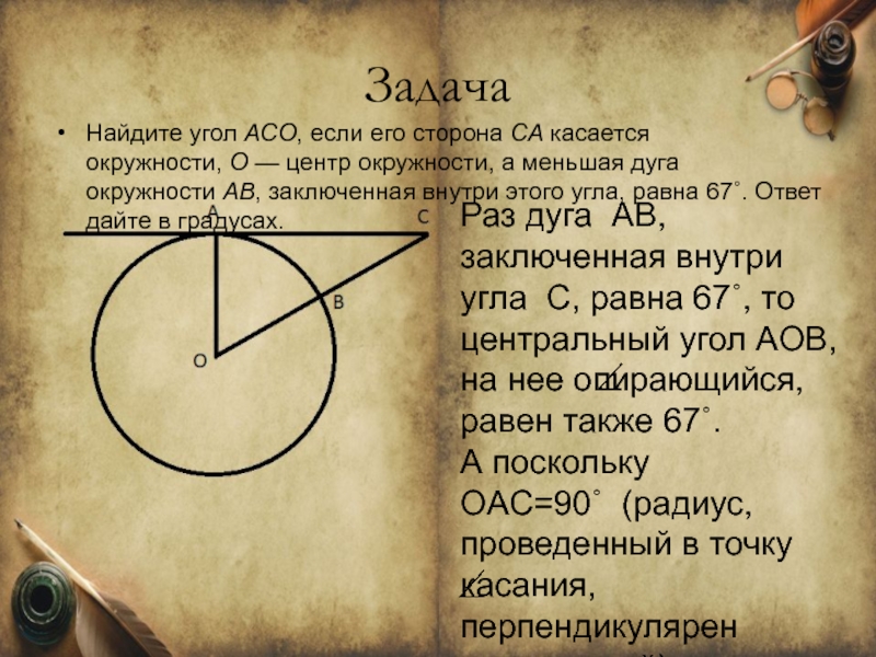 Раз дуга AB, заключенная внутри угла C, равна 67˚, то центральный угол AOB, на нее опирающийся, равен также 67˚.