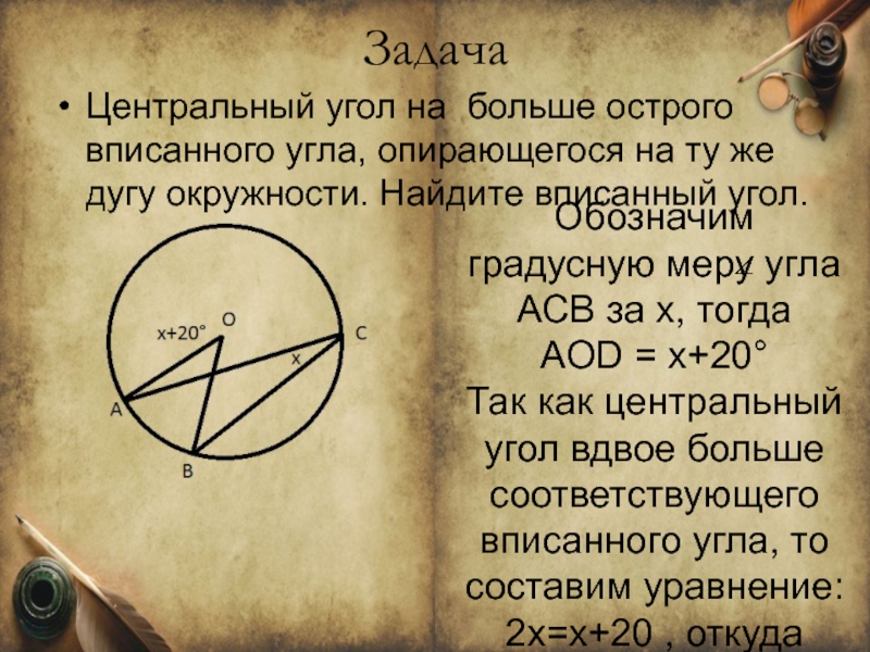 Так как центральный угол вдвое больше соответствующего вписанного угла, то составим уравнение: 2x=x+20 , откуда