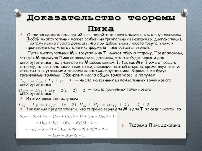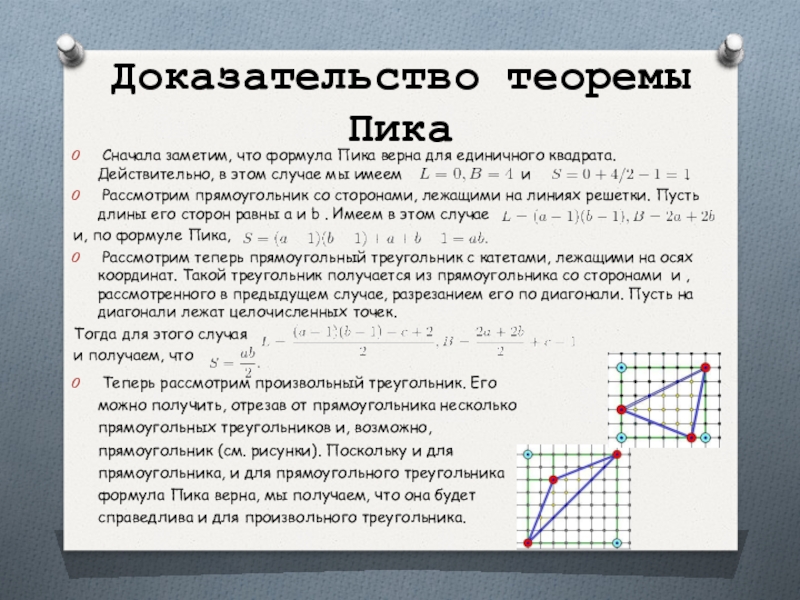 Теперь рассмотрим произвольный треугольник. Его можно получить, отрезав от прямоугольника несколько прямоугольных треугольников и, возможно, прямоугольник (см. рисунки). Поскольку и для прямоугольника, и для прямоугольного треугольника формула Пика верна, мы получаем, что она будет справедлива и для произвольного треугольника.