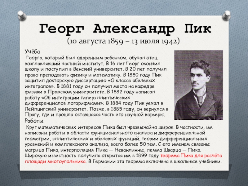 Круг математических интересов Пика был чрезвычайно широк. В частности, им написаны работы в области функционального анализа и дифференциальной геометрии, эллиптических и абелевых функций, теории дифференциальных уравнений и комплексного анализа, всего более 50 тем. С его именем связаны матрица Пика, интерполяция Пика — Неванлинны, лемма Шварца — Пика. Широкую известность получила открытая им в 1899 году теорема Пика для расчёта площади многоугольника. В Германии эта теорема включена в школьные учебники.