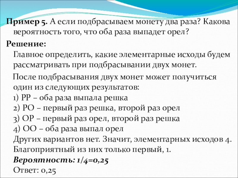 Слайд 13Пример 5. А если подбрасываем монету два раза? Какова вероятность того, что