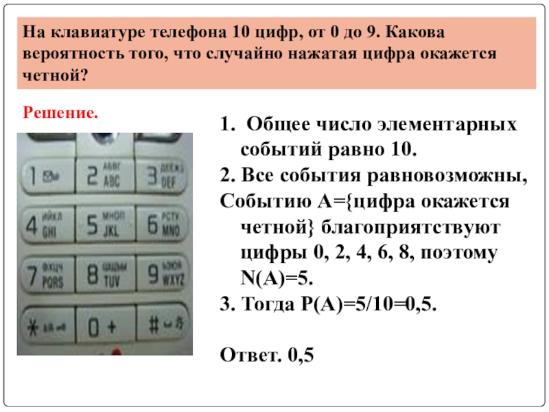 Событию А={цифра окажется четной} благоприятствуют цифры 0, 2, 4, 6, 8, поэтому N(А)=5.