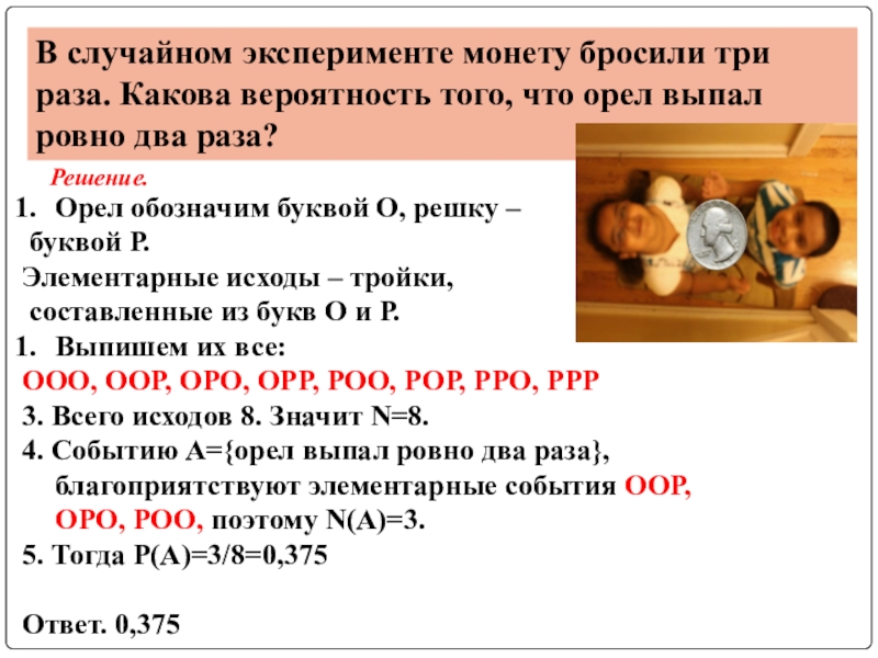 4. Событию А={орел выпал ровно два раза}, благоприятствуют элементарные события ООР, ОРО, РОО, поэтому N(A)=3.