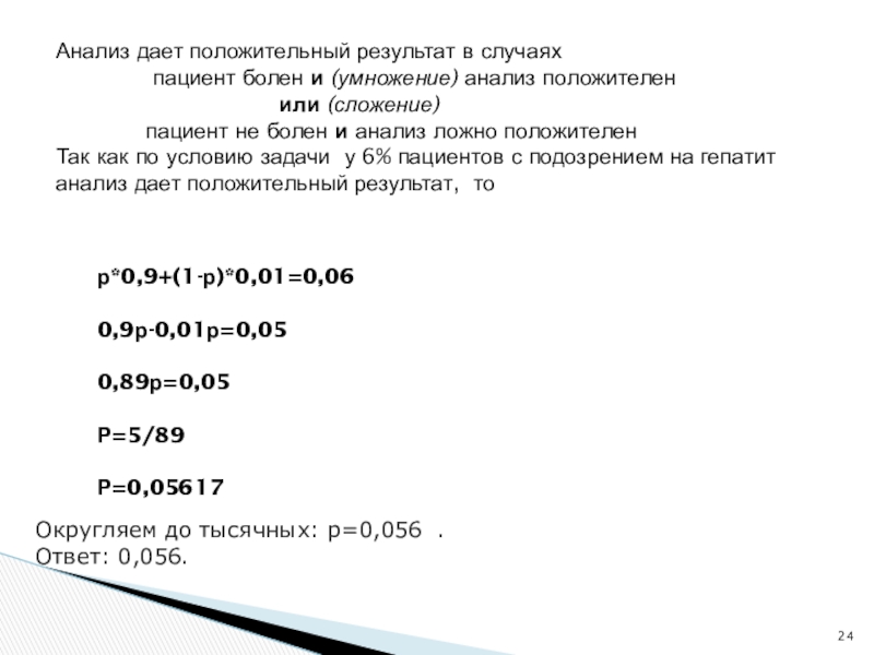 Пусть – вероятность того, что пациент, поступивший с подозрением на гепатит, действительно болен гепатитом.