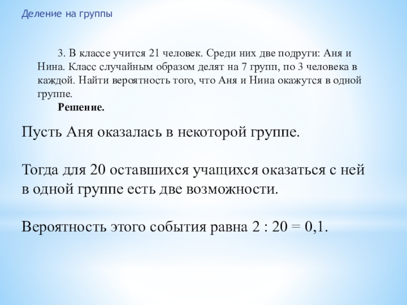 Тогда для 20 оставшихся учащихся оказаться с ней в одной группе есть две возможности.