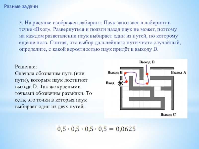 3. На рисунке изображён лабиринт. Паук заползает в лабиринт в точке «Вход». Развернуться и ползти назад паук не может, поэтому на каждом разветвлении паук выбирает один из путей, по которому ещё не полз. Считая, что выбор дальнейшего пути чисто случайный, определите, с какой вероятностью паук придёт к выходу D.